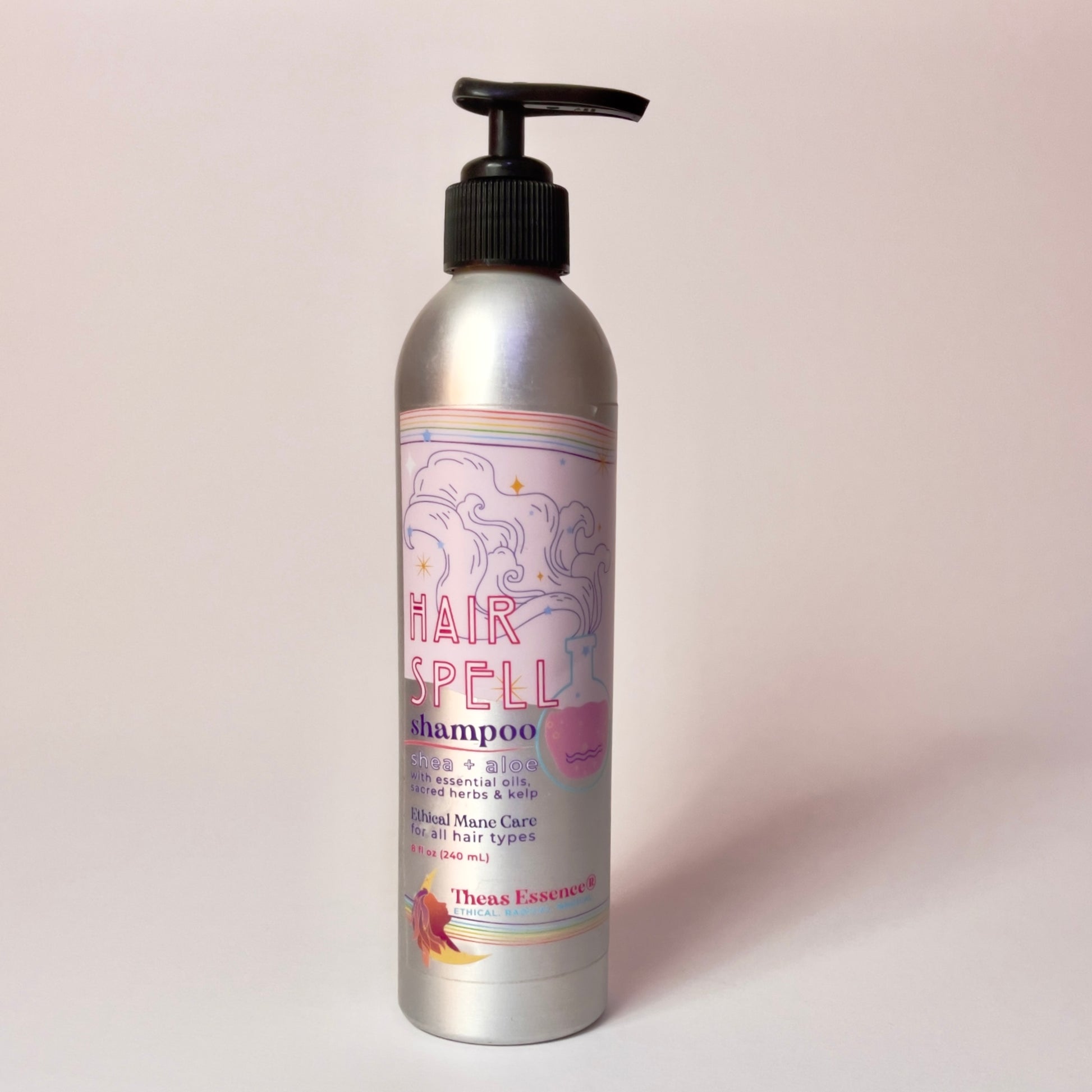 A carefully crafted lightweight and gentle formula - Hair Spell Shampoo is rich in soothing Organic Aloe, calming Organic Calendula Extract, and emollient-rich fair trade Shea with softly lathering sulfate-free, plant derived surfactants that provide a deep clean while locking in moisture. It also contains super beneficial and hair loving essential oils of Rosemary, Lavender, Tea Tree, Neroli & Ylang Ylang.